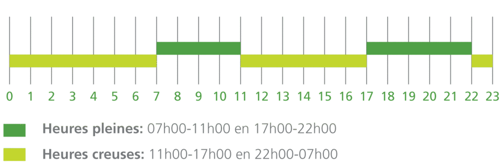 Le tarif bihoraire remplace l’ancien tarif jour/nuit en Wallonie. On parle désormais d’heures pleines (périodes de forte demande) et d’heures creuses (périodes de faible demande). Cette nouvelle tarification s’applique aussi bien en semaine que le week-end. Par conséquent, le tarif week-end disparaît.