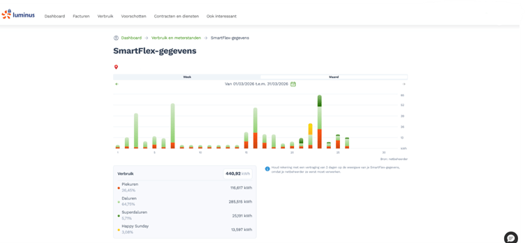 My Luminus geeft je alle tools om je energieverbruik tot in detail te volgen! Bekijk je verbruik per dag, ontdek in welk tijdslot (piekuren, (super)daluren) je zit en zie meteen wanneer het volgende begint.