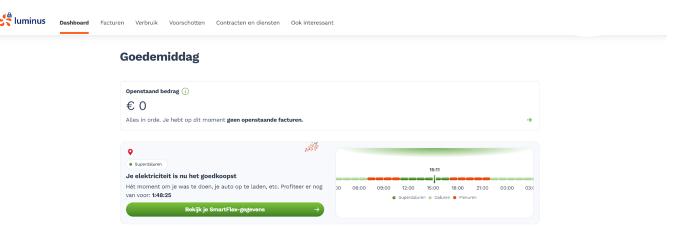 My Luminus geeft je alle tools om je energieverbruik tot in detail te volgen! Bekijk je verbruik per dag, ontdek in welk tijdslot (piekuren, (super)daluren) je zit en zie meteen wanneer het volgende begint.