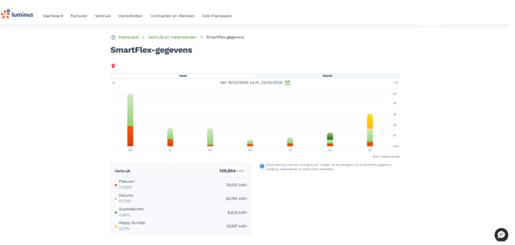 Belangrijk: De injectiegegevens van je zonnepanelen zijn niet zichtbaar op My Luminus in het SmartFlex-overzicht. Om je injectie te raadplegen, moet je de algemene verbruiksgrafiek bekijken of gebruikmaken van EnergyControl Monitor.